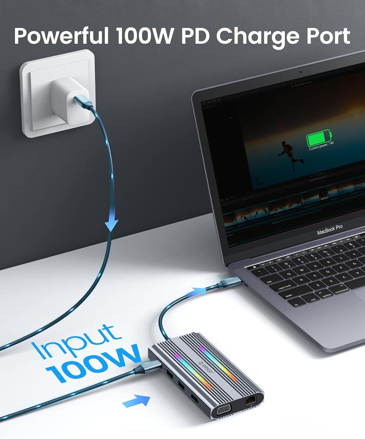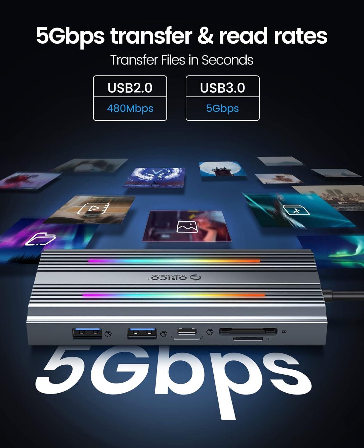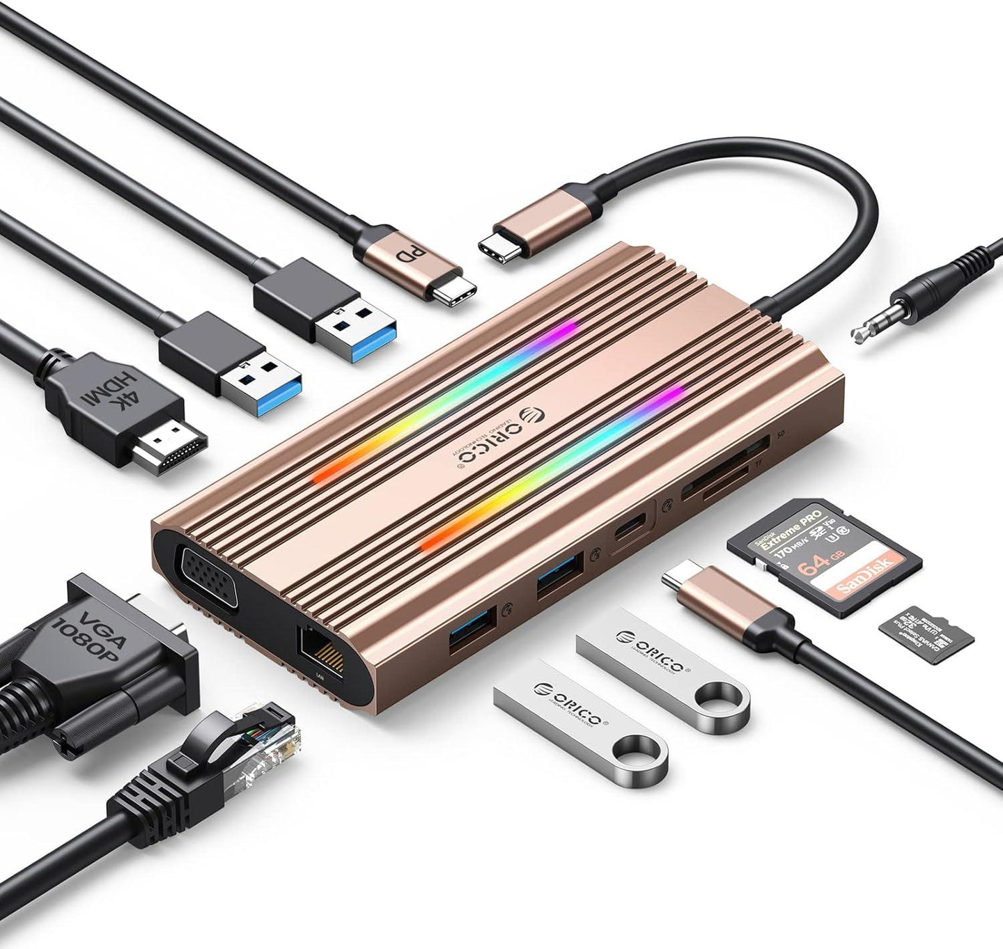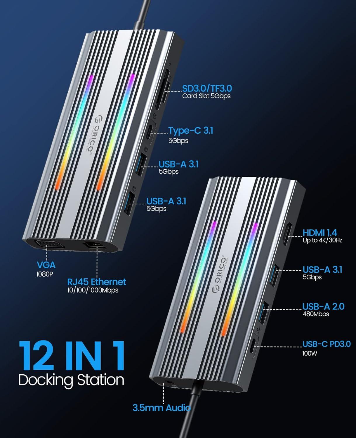 - 【12 en 1 HUB USB C】 ORICO RGB Accarotage a 12 ports fonctionnels, y compris le 1 × PD 100W port pour le chargement, 1 × HDMI 4K port , 1 × 1080p VGA port, 3 × USB-A 3.0 ports, 1 × USB-A 2.0 port, 1 × USB -C 3.0 port, 1 Ethernet Gigabit port, interface de lecteur de carte SD & TF et audio 3.5 mm. Répondre à une variété de besoins d'expansion, des bureaux et des divertissements ne sont pas retardés.