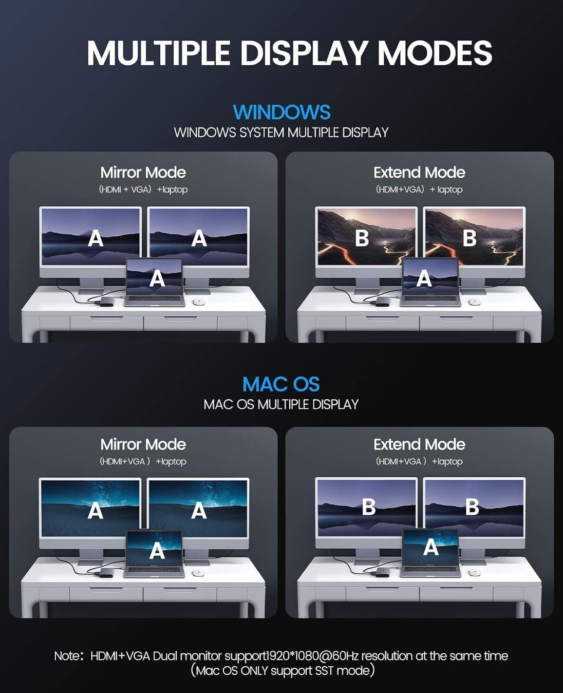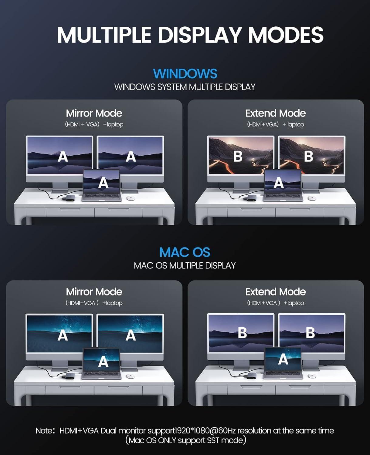 - 🎉【Sortie ultra 4K et double affichage】 Sorties de port HDMI jusqu'à 4K @ 30Hz, parfaites pour refléter ou étendre votre écran à un HDTV, moniteur ou projecteur pour créer une expérience visuelle de type cinéma. Prend en charge le mode Dual Affiche du système Windows (AAA et ABB), et peut prendre en charge le mode Mac OS System Mirror ou Extende (AAA et ABB). M1 MAC prend uniquement en charge AA/AB.